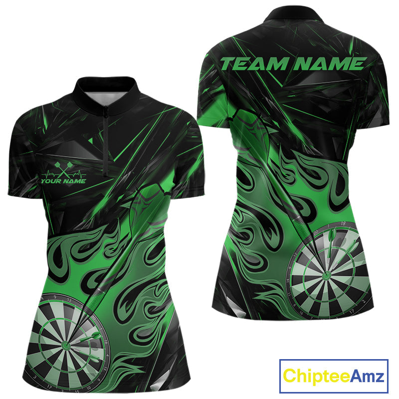 Custom Black And Green Flame Dartboard Dart Women Quarter-Zip Shirt, Dart Players Outfits IPHW9690