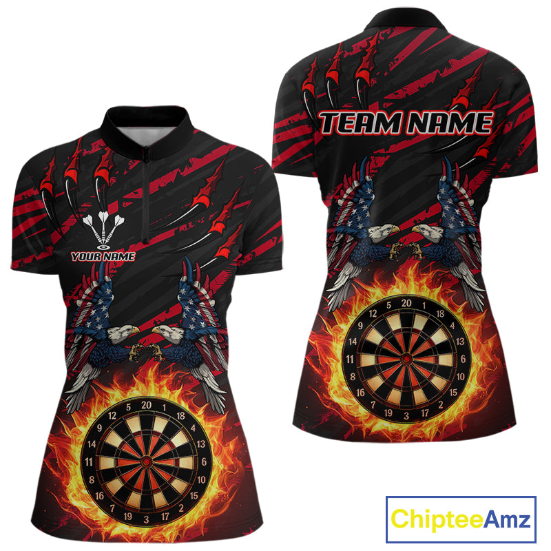 Flaming Darts & US Flag Eagle Women's Red Darts Polo Shirt - Custom Name For Dart Players NYN0802
