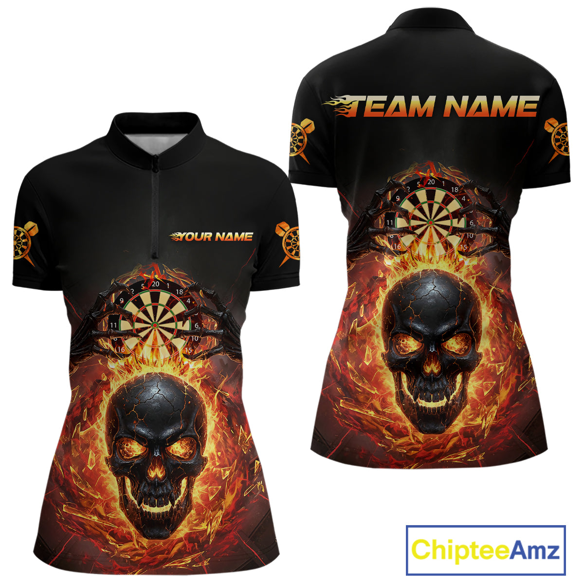 Custom Red Flames Skull Broken Glass Women's Darts Quarter-Zip Shirt Outfits Dart Jerseys NYN1902