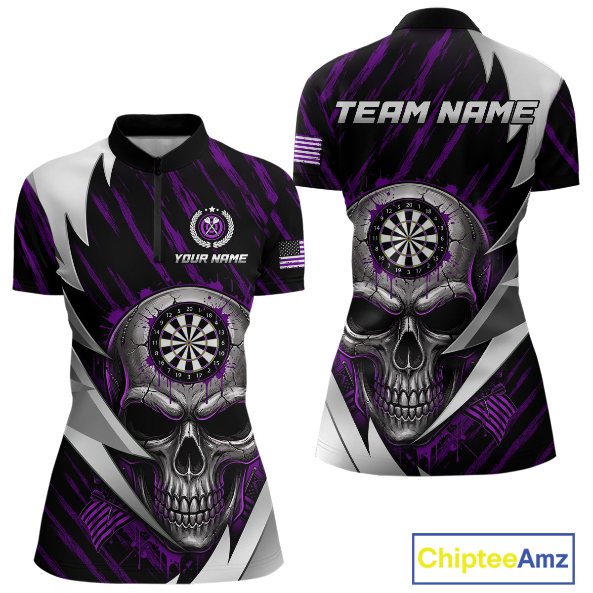 Silver Skull Purple Grunge US Flag Women Darts Quarter-Zip Shirt Custom Name Dart League Jerseys NYN2062