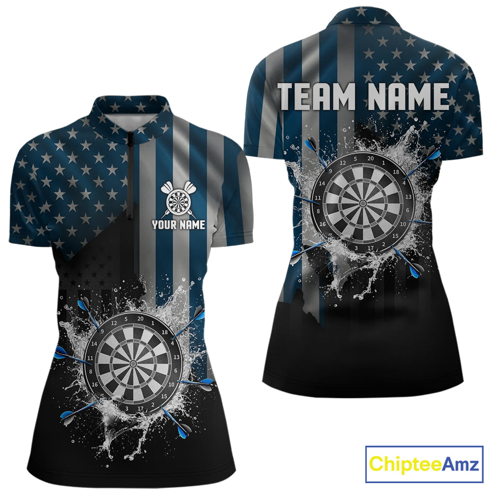 Custom Blue US Flag Water Dartboard Women Darts Quarter-Zip League Shirts Patriotic Dart Jerseys NYN2246