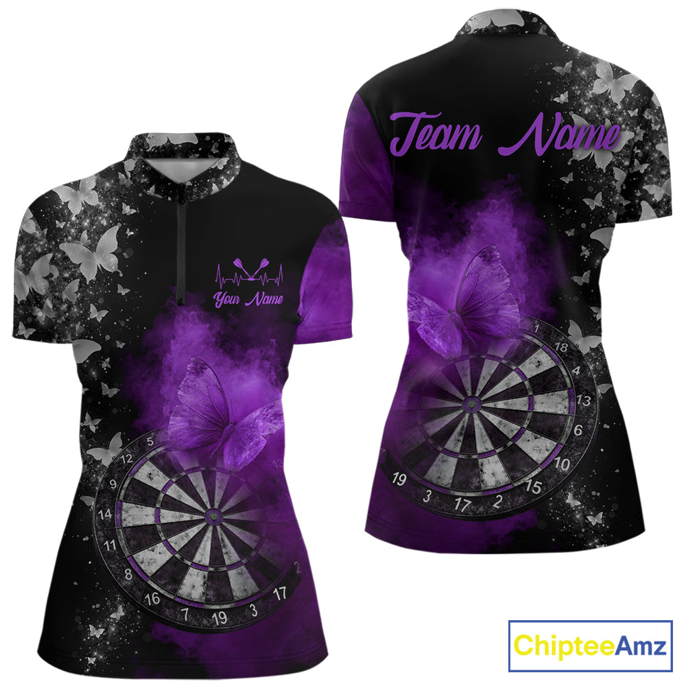 Custom Silver Butterfly Purple Smoking Grunge Dartboard Women Darts Quarter-Zip Shirts Dart Jerseys NYN2268