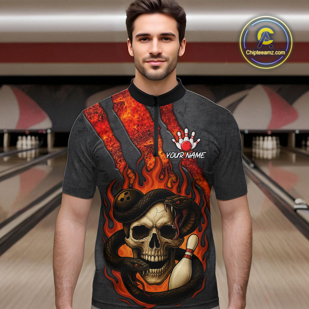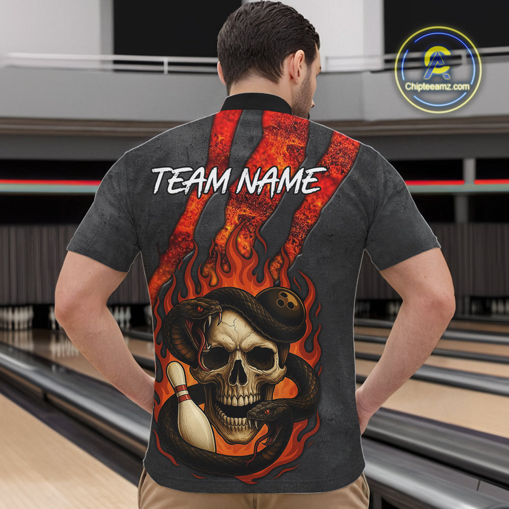 Red Flame Skull Snake Bowling Polo, Quarter Zip Shirts for Men Custom Team Bowling Jersey NQS10937