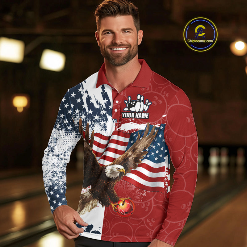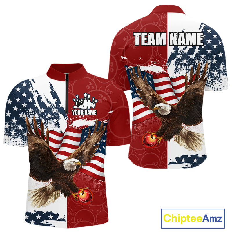 Red, White, Blue American Flag Eagle Men Bowling Shirt Custom Patriotic Red Camo Bowling Team Jersey NQS9864