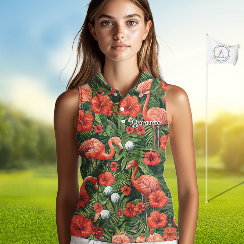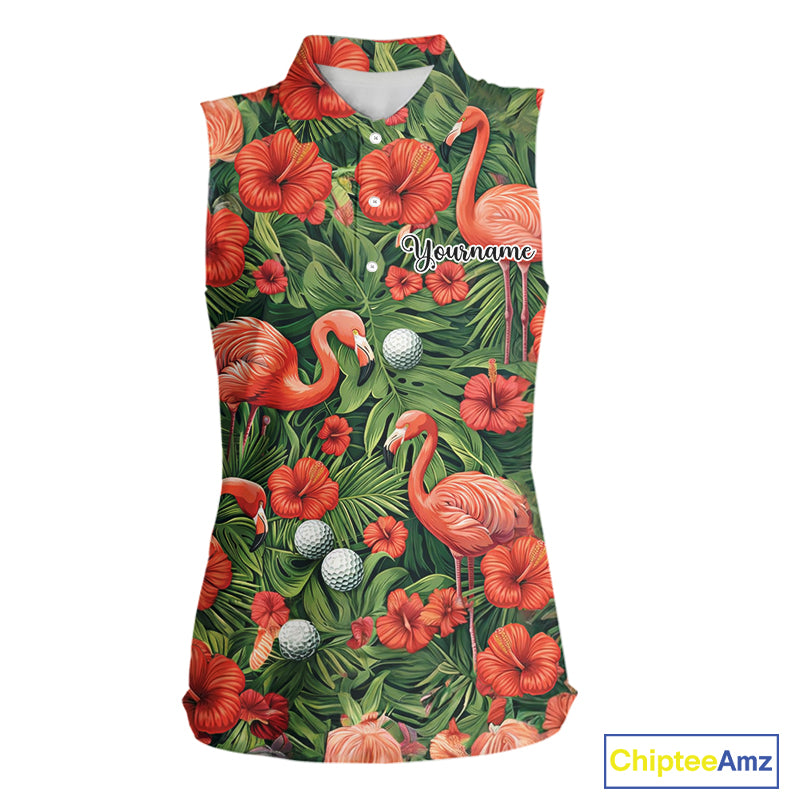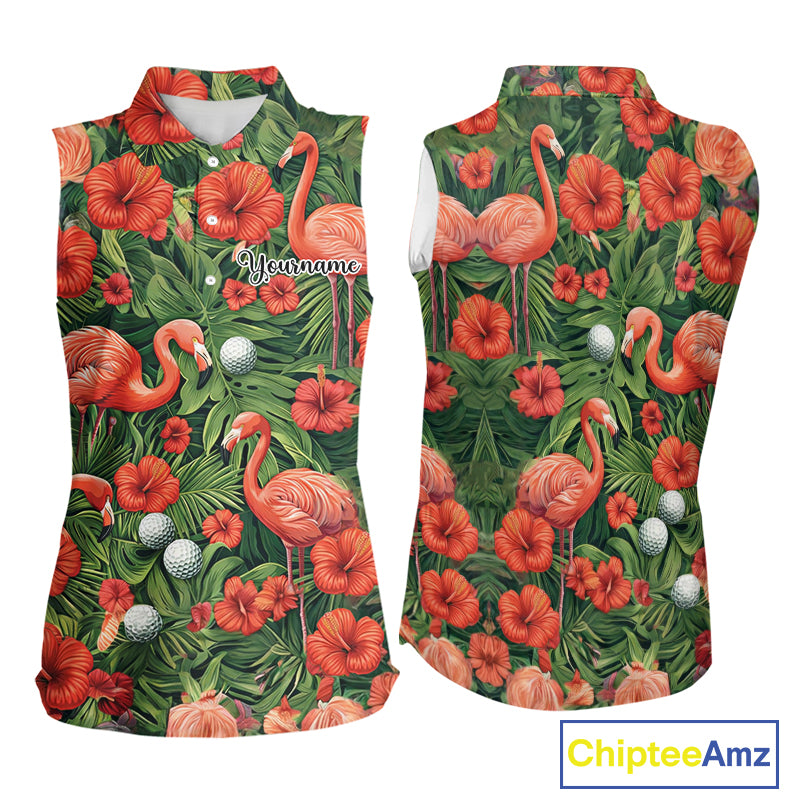 Custom Hibicus Flamingo Floral Golf Sleeveless Polo Shirts For Womens, Flower Golf Team Shirts NHT540