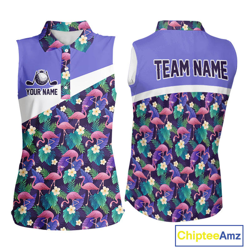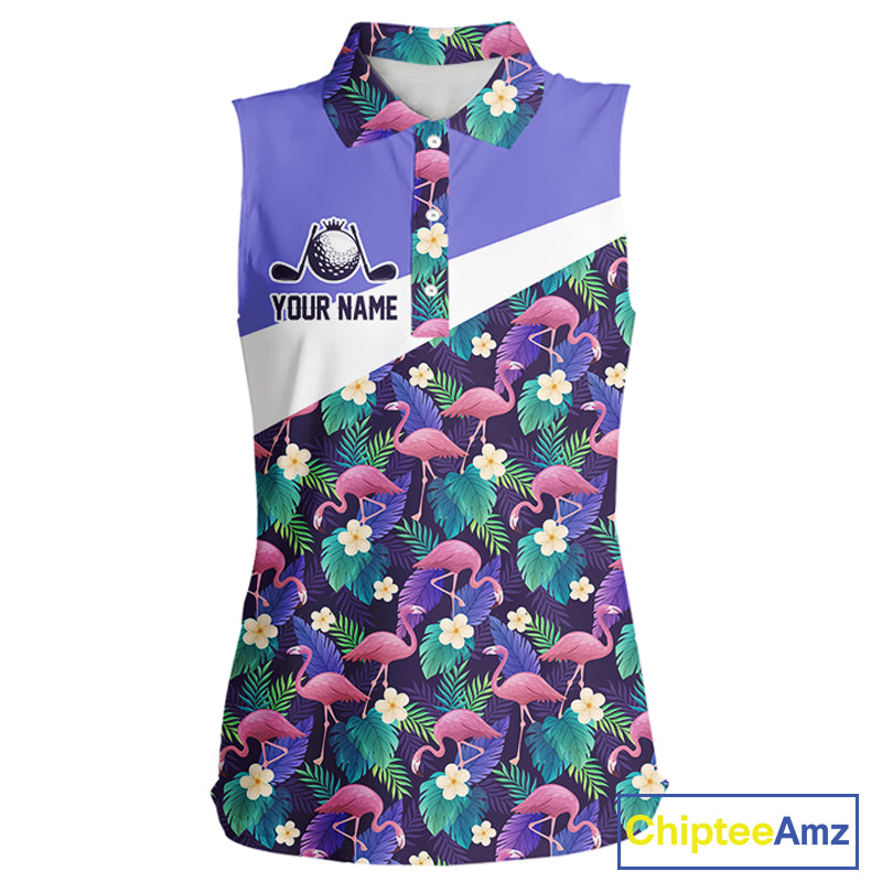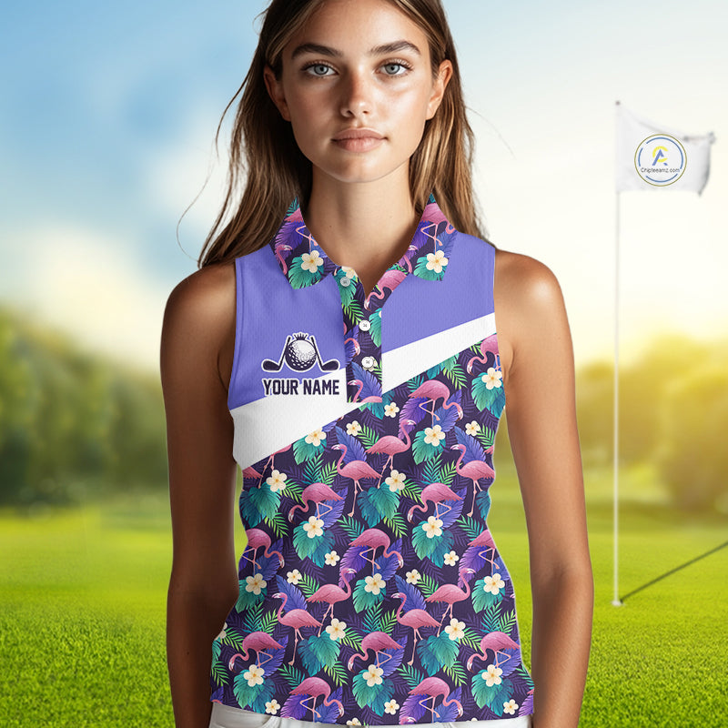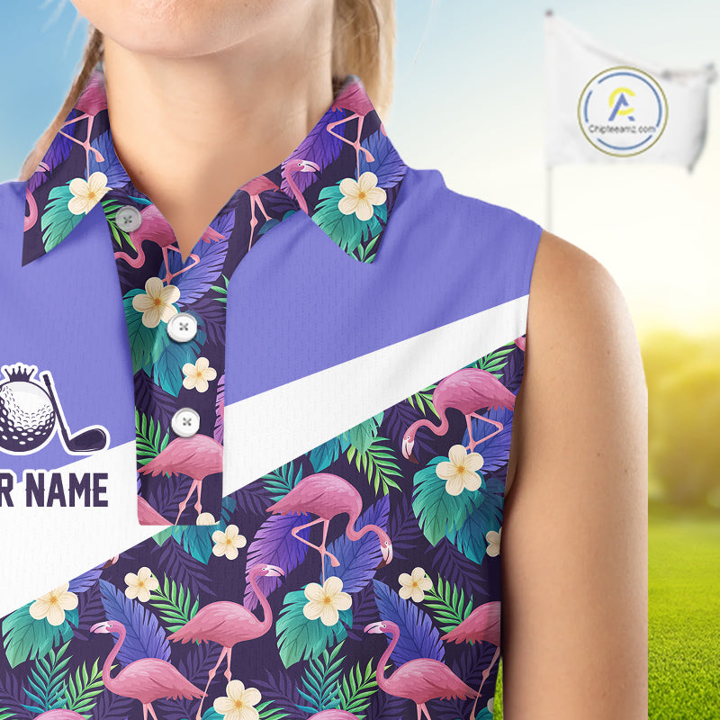Purple Flamingo Tropical Pattern Womens Sleeveless Golf Polo Shirt Custom Golf Shirts For Golfer NHT584