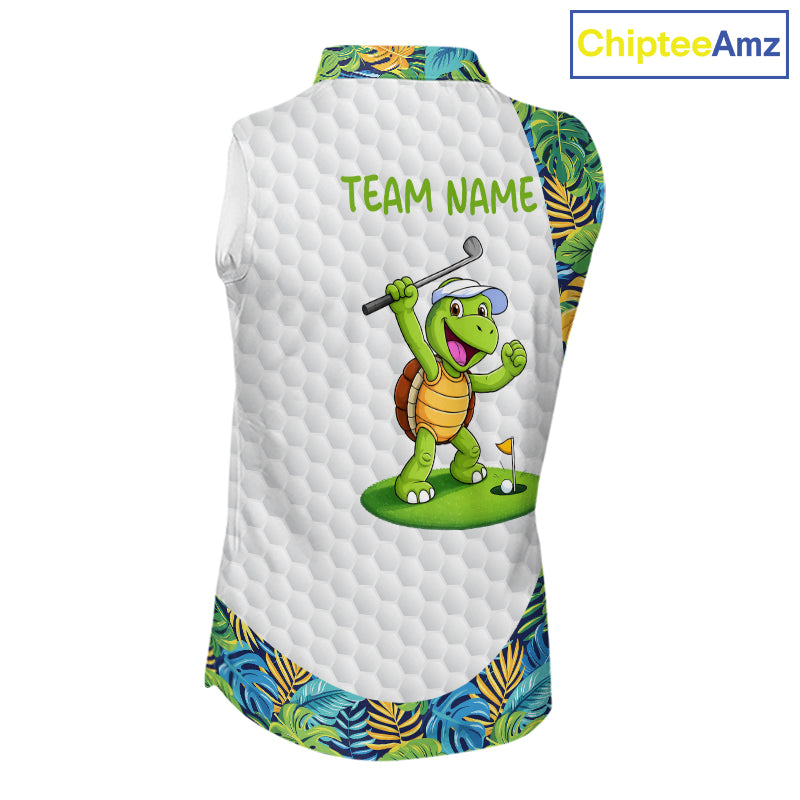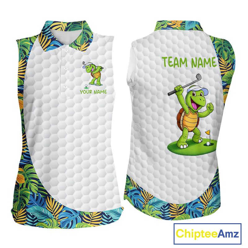 Golfing Turtle Womens Sleeveless Golf Polo Shirt Custom Tropical Pattern Monstera Golf Team Shirts NYN2907