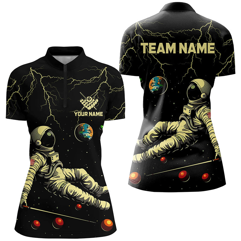 Personalized Black Astronaut Lightning Galaxy Billiard Shirts For Women, Funny Billiard Apparel TDM2029