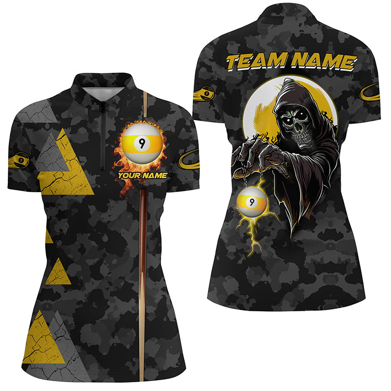 Funny Death Skeleton Ball 9 Fire Custom Camo Women Billiard Shirts, Best 9 Ball Pool Jerseys TDM2071