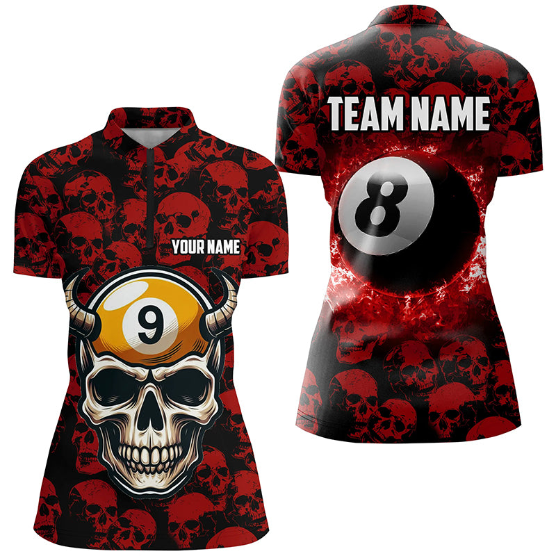 Personalized Billiard Jersey 8 & 9 Ball Custom Funny Skull Pattern Billiard Shirts For Women |Red TDM2370