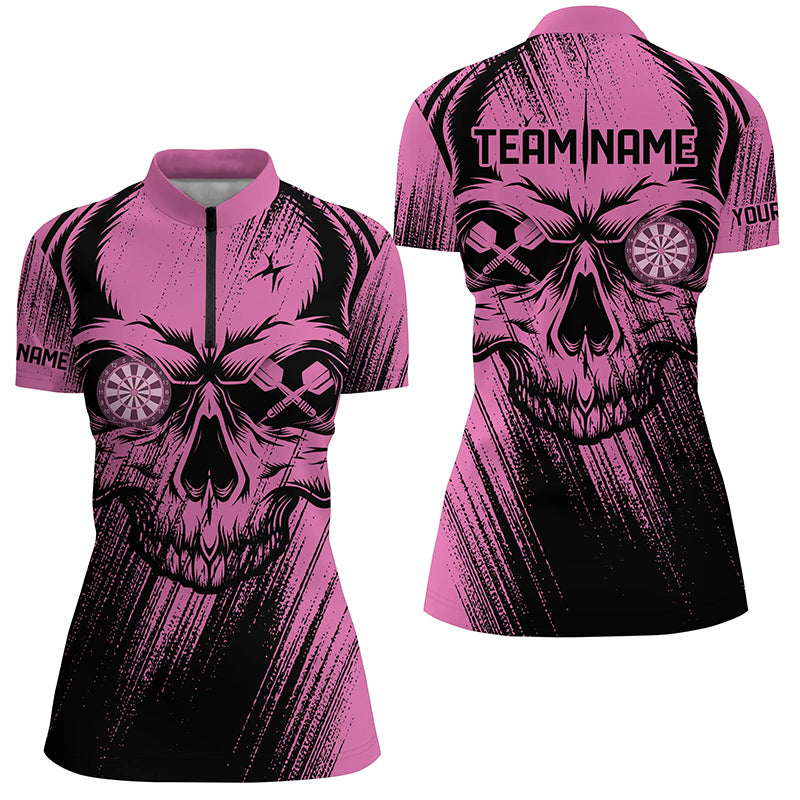 Personalized Pink Grunge Skull Darts Polo & Quarter-Zip Shirt For Women Custom Cool Darts Team Jersey TDM2531