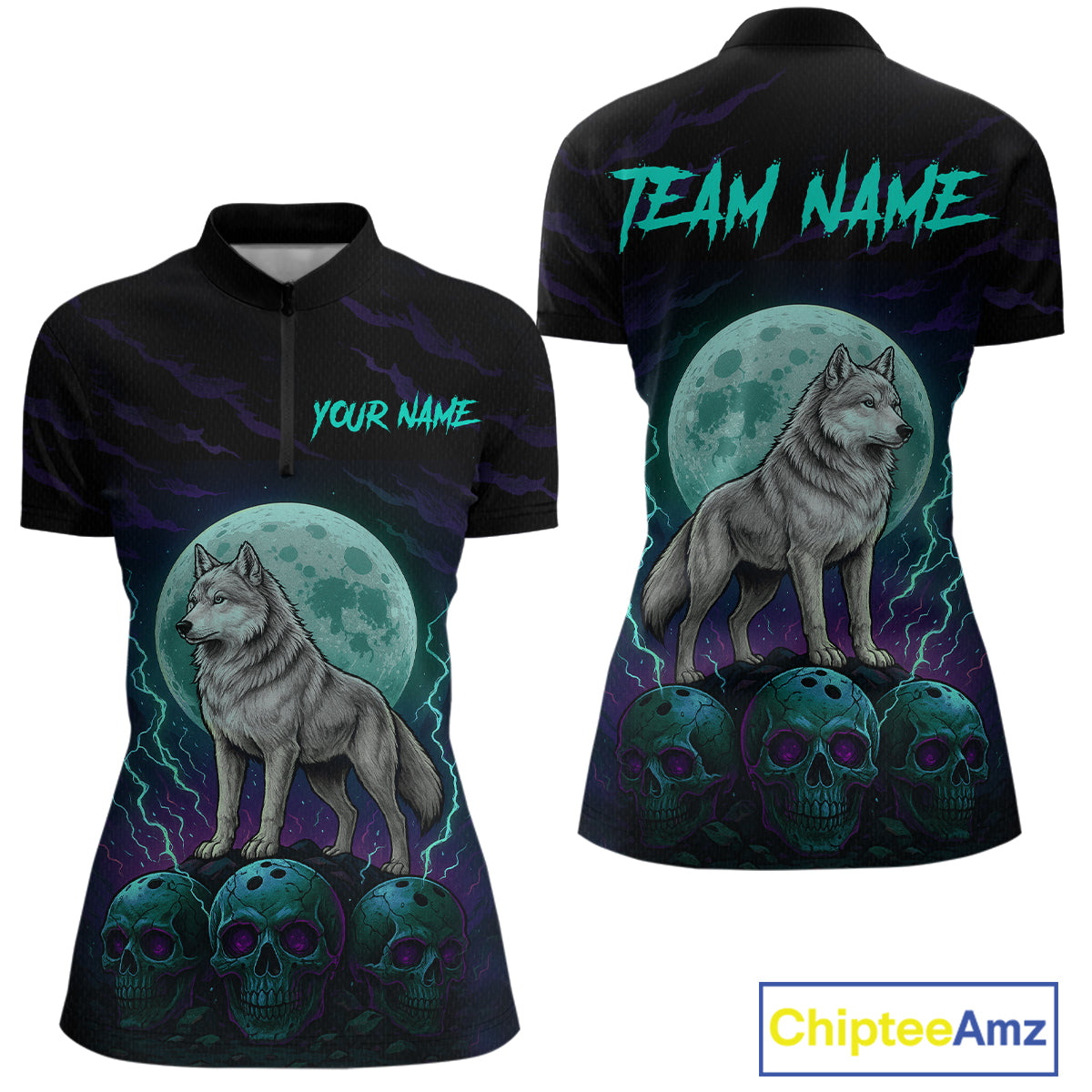 Teal And Purple Wolf & Skull Bowling Team Shirt for Women Custom Bowling League Jersey Bowling Unisex QZT750