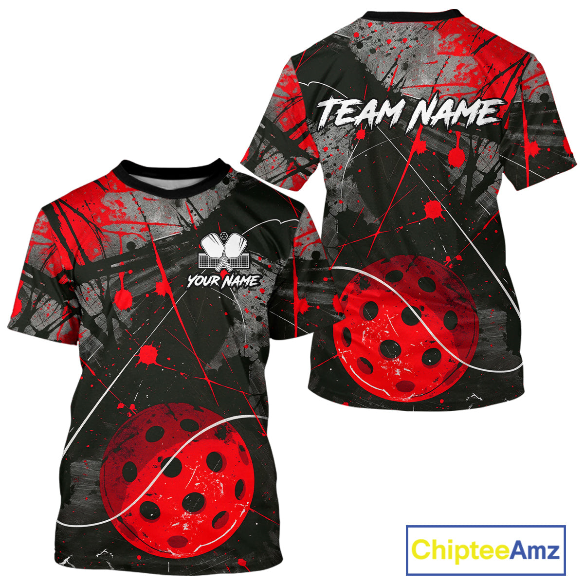 Custom Black Grunge Red Pickleball Ball T-Shirt For Men Splatter Pickleball Jerseys NYN2481