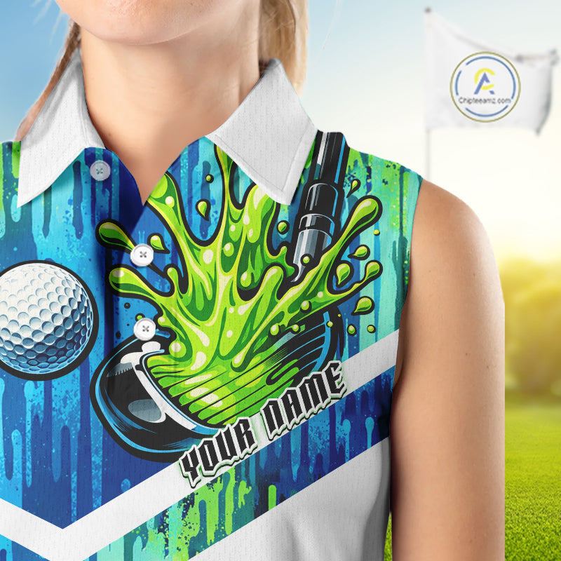 Watercolor Womens Sleeveless Golf Polo Shirt Custom Green Golf Ball Pattern Golf Tops For Ladies NHN0113