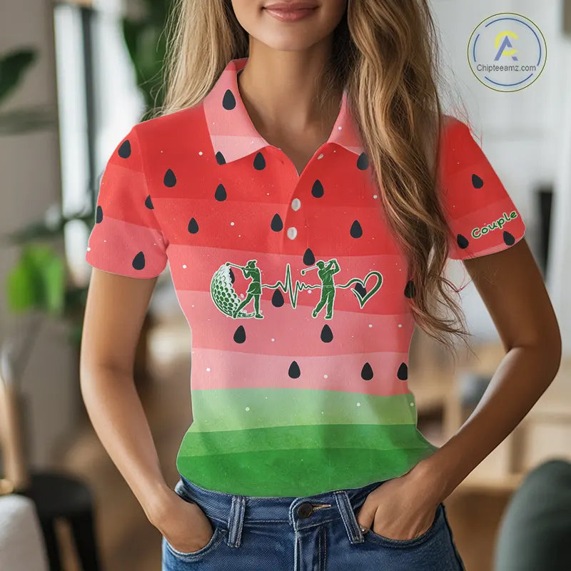 Watermelon Polo Shirt For Men Women, Heartbeat Couple Matching Golf Polo Shirt Custom Valentines Outfit NHN0148