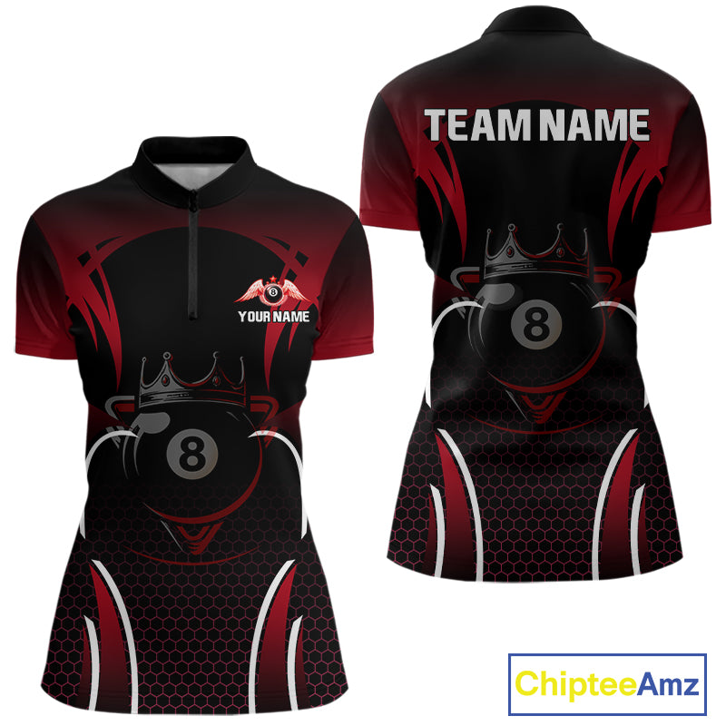 Black & Red 8 Ball Crown Women's Billiard Polo & 1/4 Zip Shirt Custom Billiard Team Jersey NYN2344