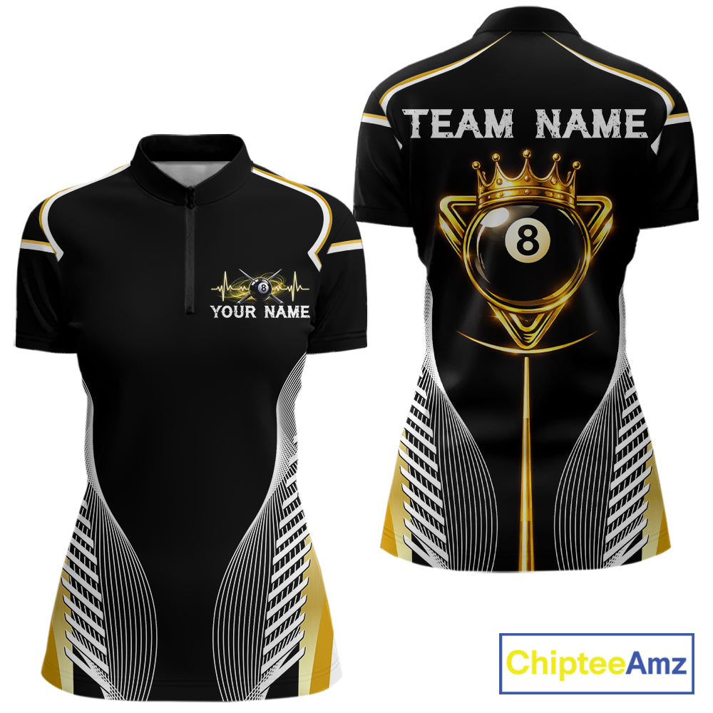 Black & Gold 8 Ball Pool Crown Women Billiard Team Shirt Custom Billiards Balls & Cue Gifts NYN2394