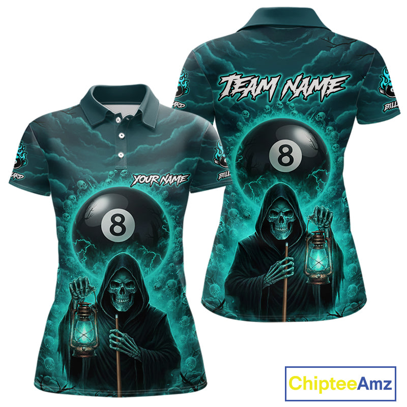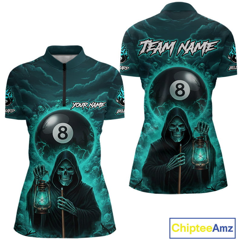 Teal Thunder Grim Reaper 8 Ball Pool Women Polo & 1/4-Zip Shirt Custom Billiard Ball & Cue Gifts NYN2436