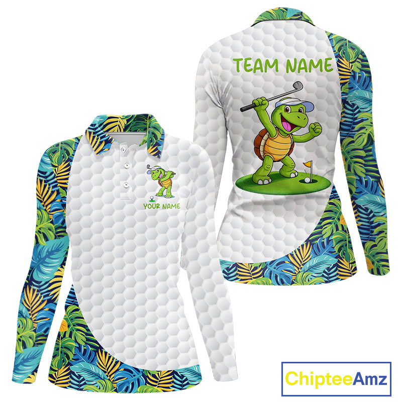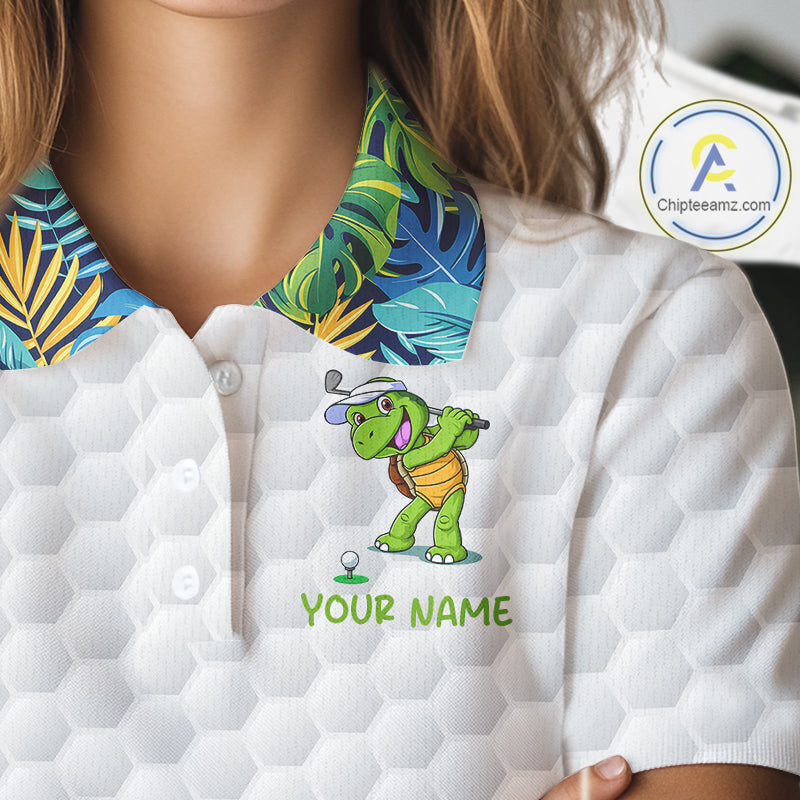 Golfing Turtle Womens Golf Polo Shirt Custom Tropical Pattern Monstera Golf Team Shirts NYN2907