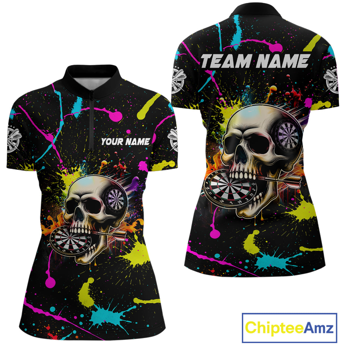 Personalized Funny Skull Colorful Paint Dart Shirt For Women Custom Darts Team Jersey Polo & 1/4 Zip TDM4213