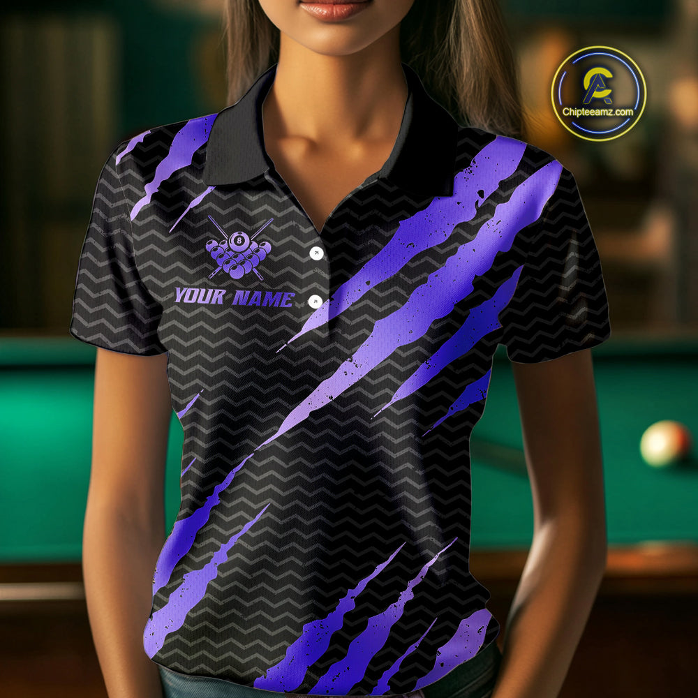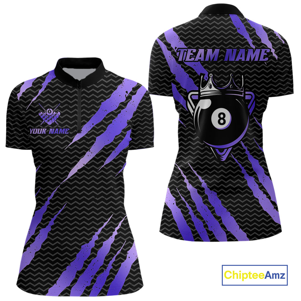 Black And Purple Scratch Billiard Shirt For Women Custom 8 Ball Crown Pool Team Jersey Polo, 1/4 Zip TDM4240