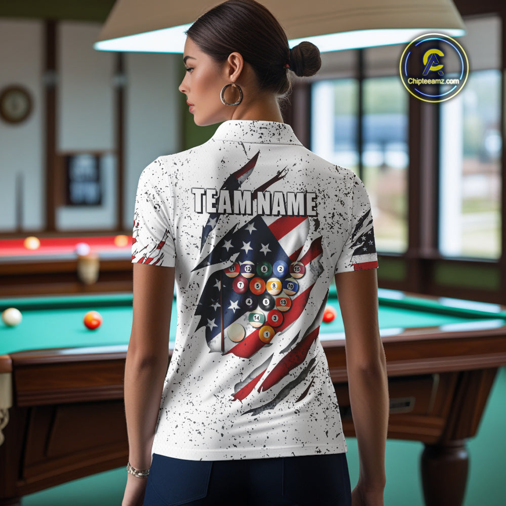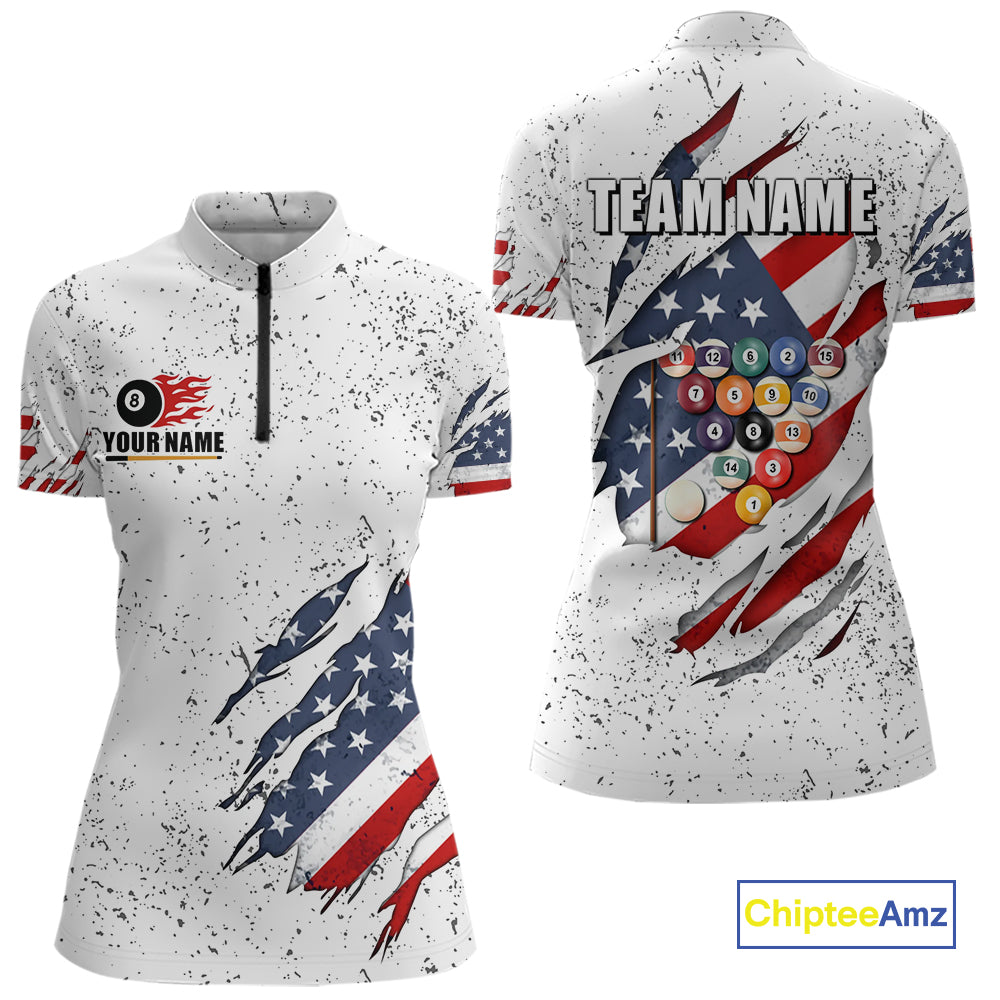Personalized American Flag White Grunge Billiard Shirt For Women, Patriotic 8 Ball Pool Team Jersey TDM4443