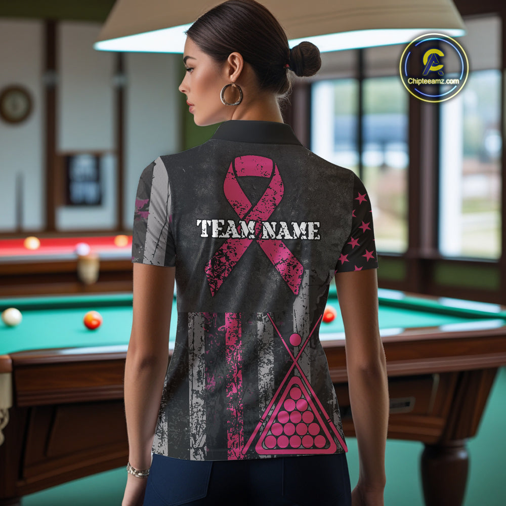 Custom Pink Ribbon Grunge US Flag Billiard Shirt For Women, Patriotic Breast Cancer Pool Team Jersey TDM4624