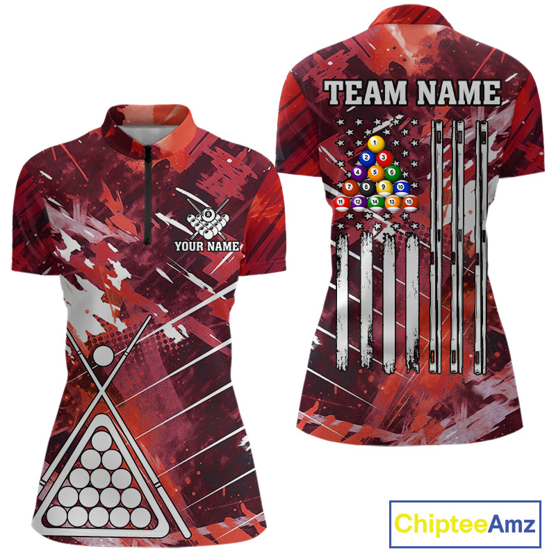 Red Grunge US Flag Billiard Shirt For Women Custom 8 Ball Pool Team Shirt, Funny Billiard Jersey TDM4970