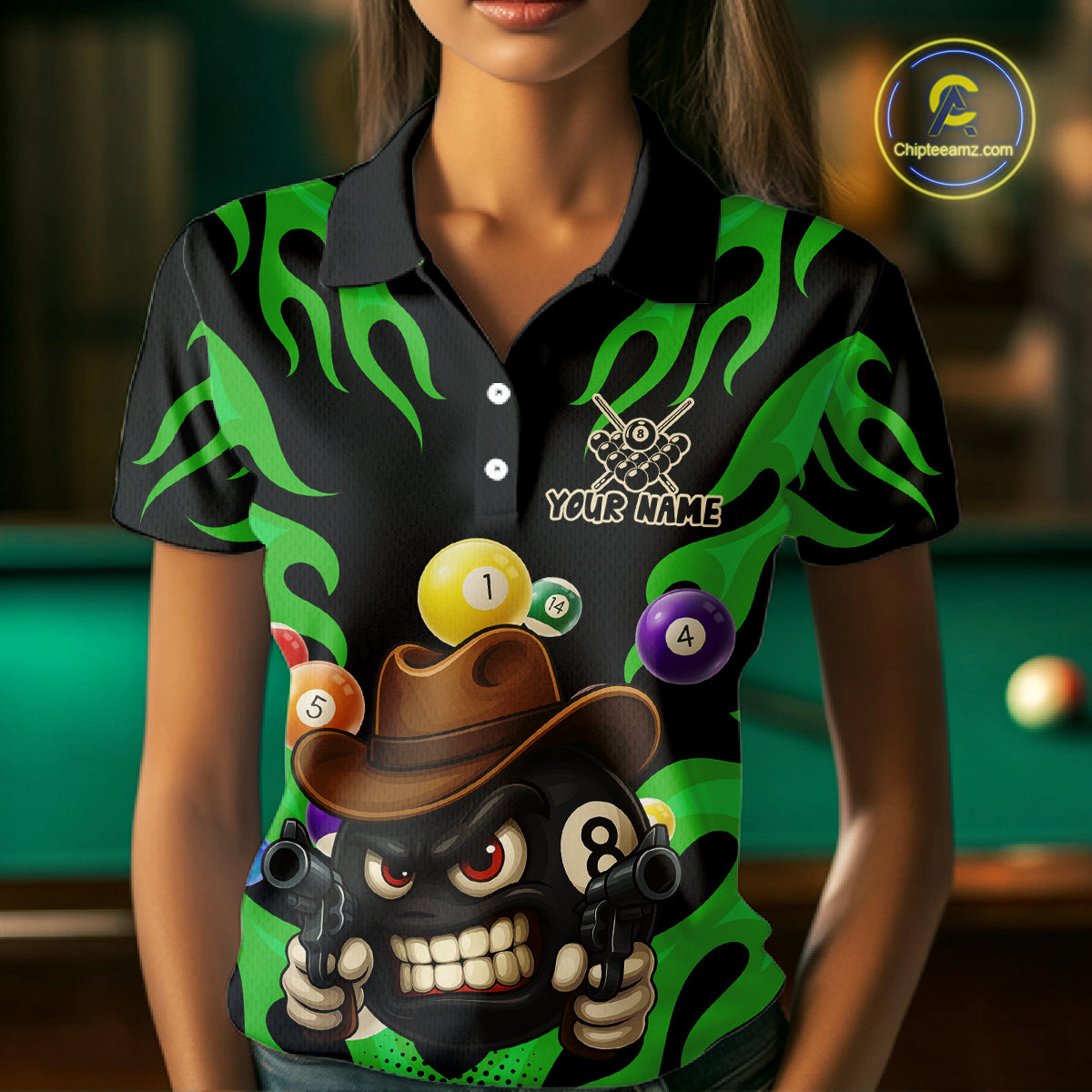 Personalized Green Funny Flame 8 Ball Billiard Shirt For Women Custom Pool Team Jersey Polo, 1/4 Zip TDM4985