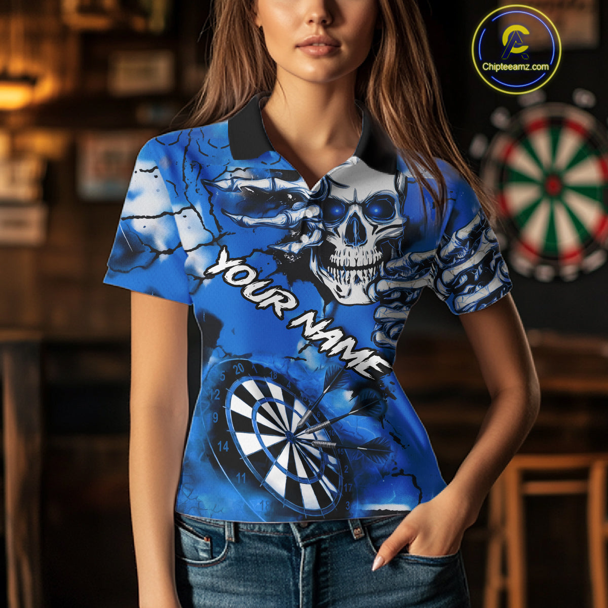 Personalized Blue Grunge Skull Darts Shirt For Women Custom Darts Team Jersey Polo & Quarter Zip TDM5029