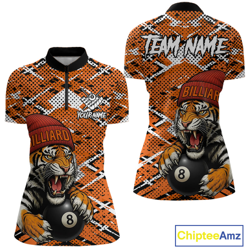 Personalized Orange Black Grunge Tiger Billiard Shirt For Women Custom 8 Ball Pool Team Jersey TDM5100