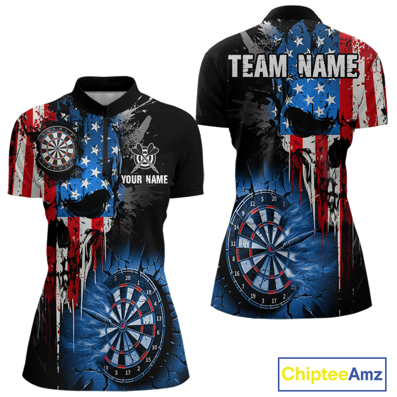 Patriotic American Flag Grunge Skull Womens Dart Shirts Custom Dart Jerseys Team Polo & 1/4 Zip TDM5171