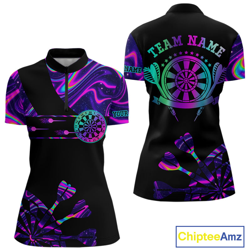 Neon Purple Holographic Womens Dart Shirts Custom Glowing Dart Jersey Team Polo & Quarter Zip TDM5172