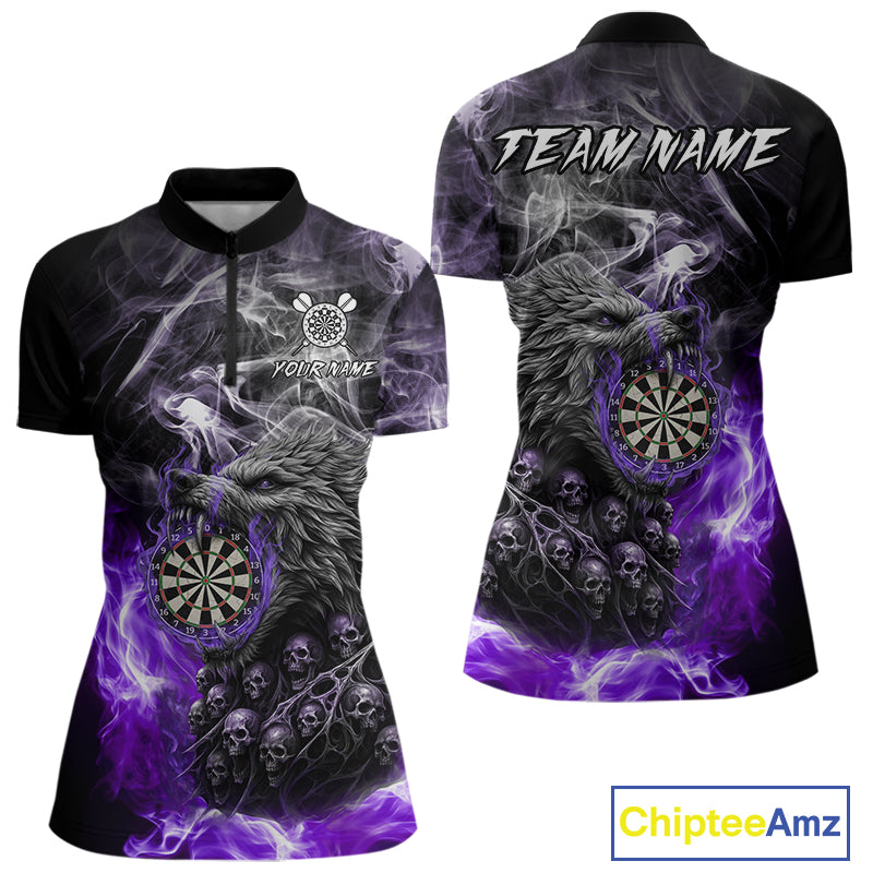 Personalized Wolf And Skull Smoke Purple Womens Dart Shirts Custom Dart Jerseys Team Polo & 1/4 Zip TDM5184