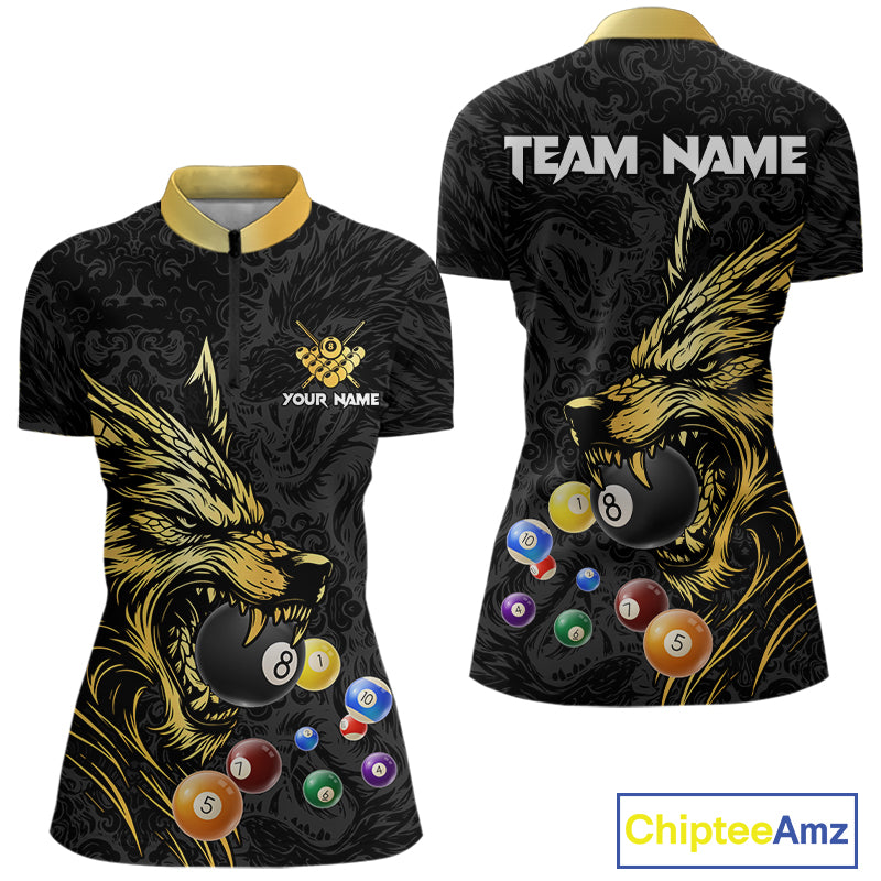 Personalized Wolf Billiard Balls Pool Shirts For Women, Black And Gold Billiard League Team Jerseys TDM5204