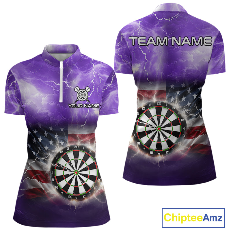 Purple American Flag Thunder Lightning Darts Shirt For Women Custom Darts Jersey Team Polo & 1/4 Zip TDM5269