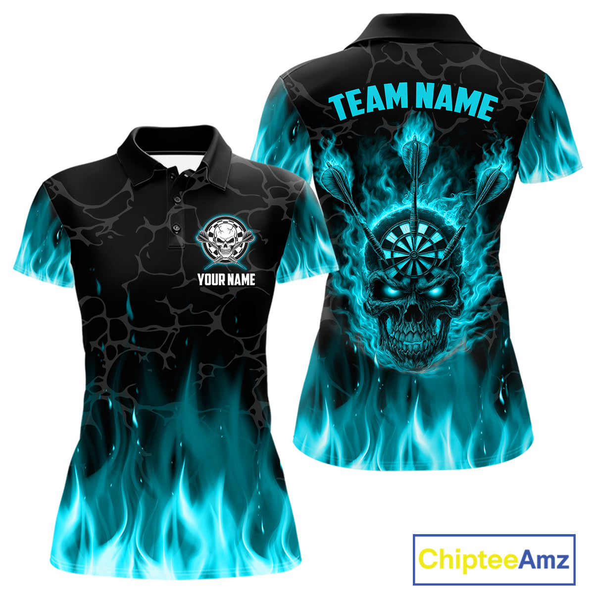 Fire Flame Skull Darts Polo & Quarter Zip Custom Darts Shirts For Women, Darts Team Jersey|Turquoise TDM5320
