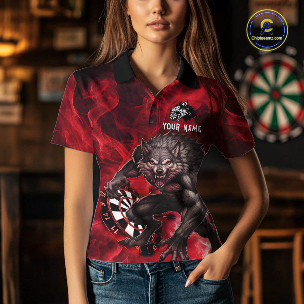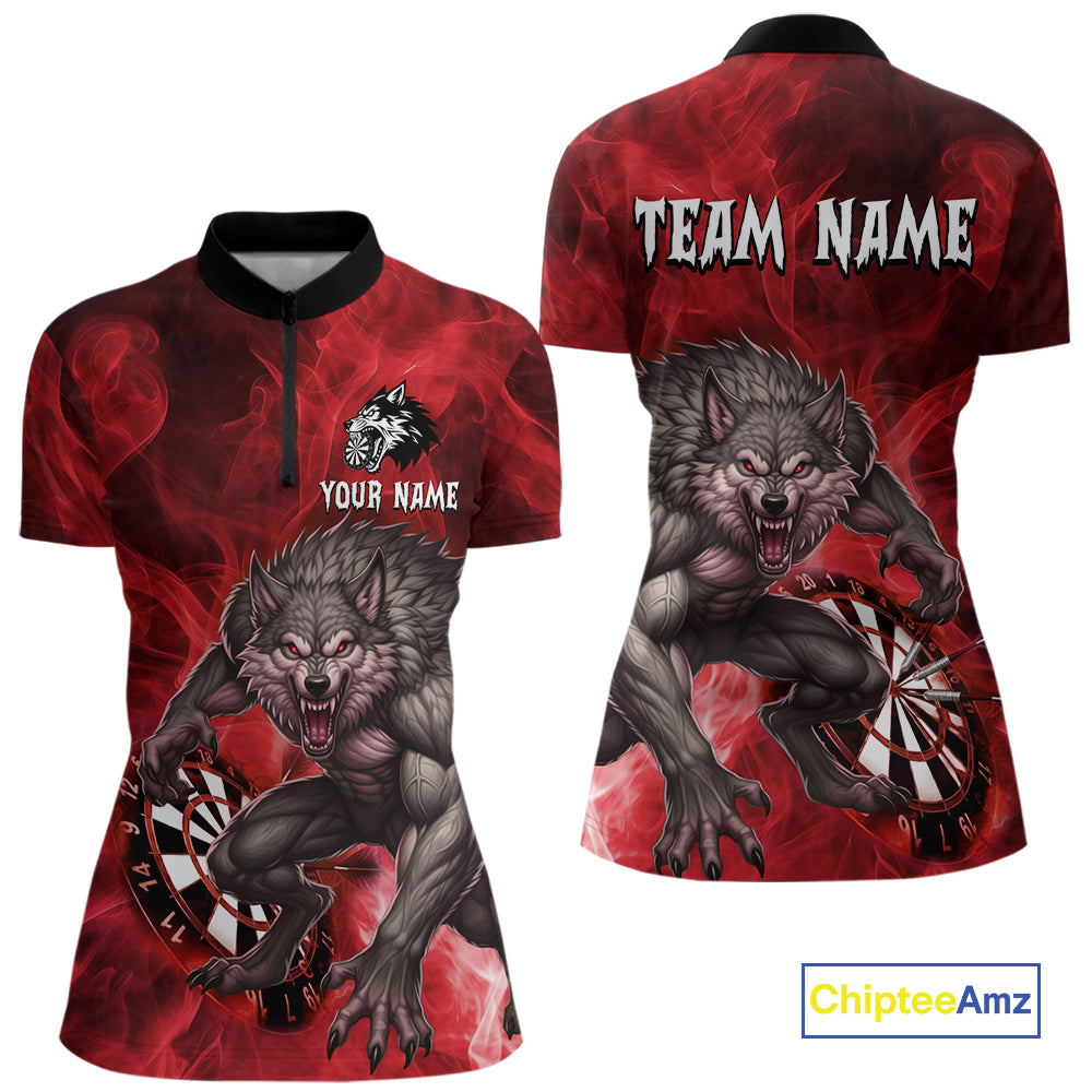 Red Flaming Wolf Darts Shirt For Women Custom Darts League Jersey Team Polo & Quarter Zip TDM5359