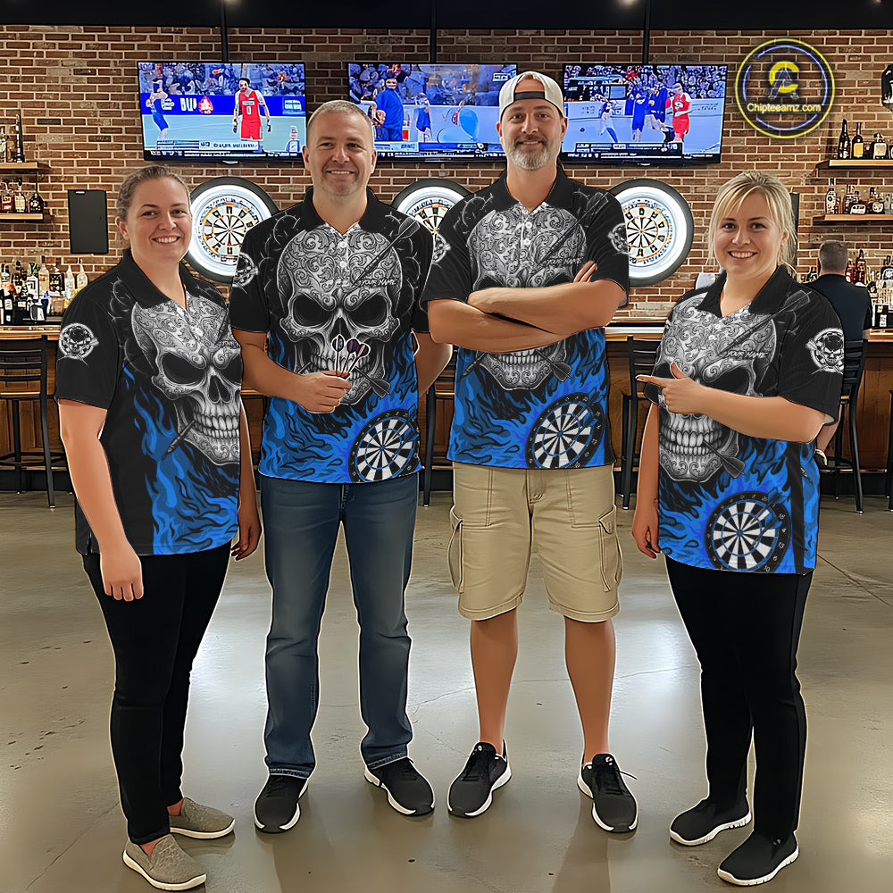 Black And Blue Flaming Skull Darts Shirt For Women Custom Darts League Jersey Team Polo & 1/4 Zip TDM5436