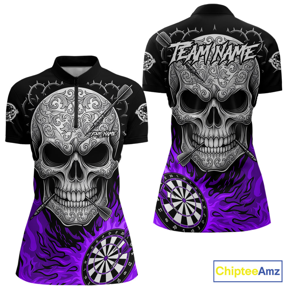 Black And Purple Flaming Skull Darts Shirt For Women Custom Darts League Jersey Team Polo & 1/4 Zip TDM5437