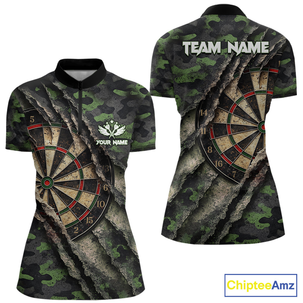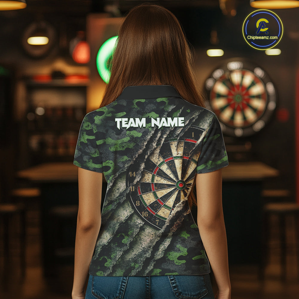 Green Retro Grunge Camo Darts Shirt For Women Custom Darts Jersey Team Polo & Quarter Zip Uniform TDM5450