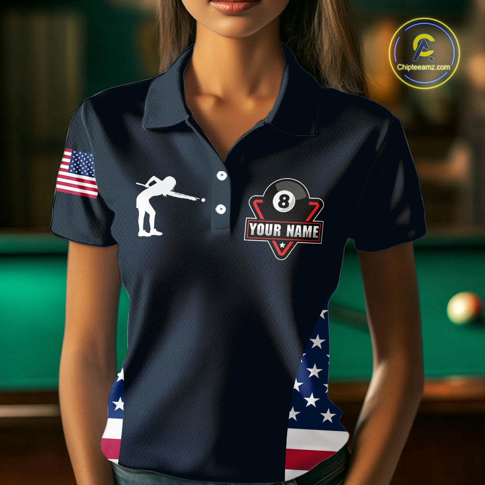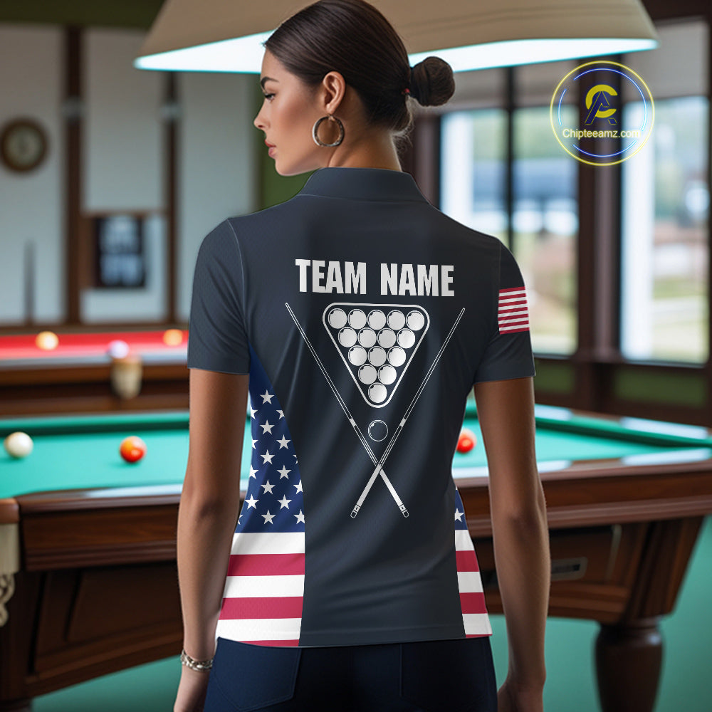 Custom US Flag 8 Ball Pool Billiard Shirt For Women, Billiard Team Jersey Polo & 1/4 Zip |Navy Blue TDM5478