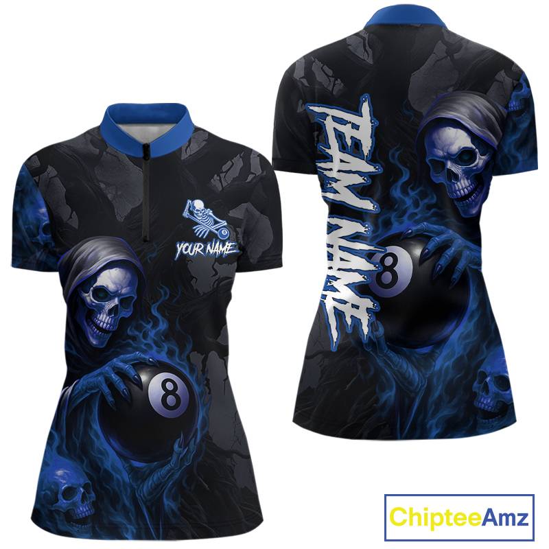 Grim Reaper Custom Flame 8 Ball Pool Billiard Shirt For Women, Black And Blue Billiard Team Jersey TDM5533