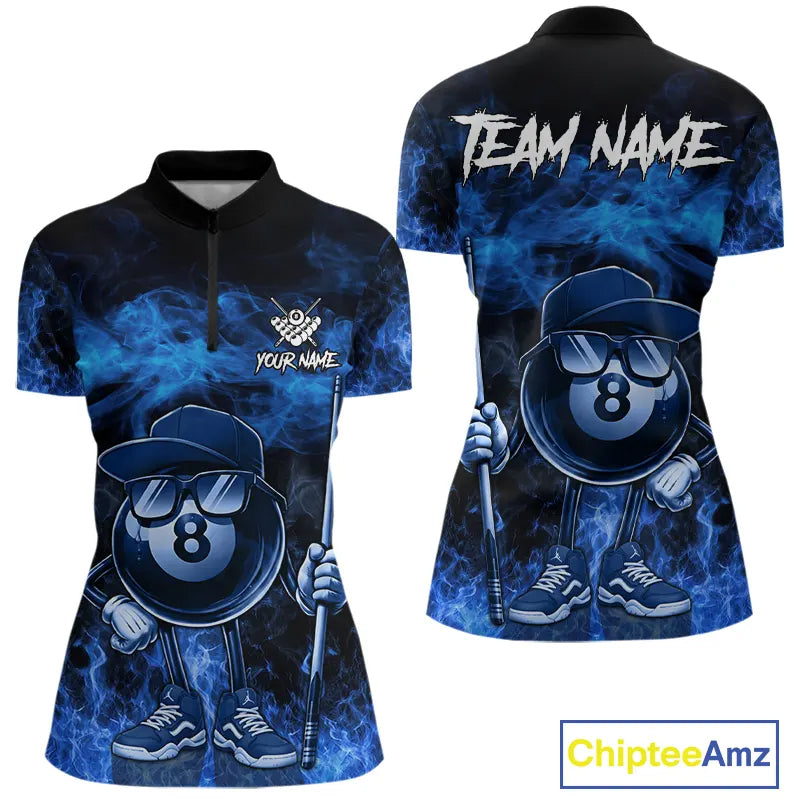 Blue Funny 8 Ball Pool Flame Smoke Billiard Shirt For Women Custom Billiard Team Jersey Uniform TDM5546