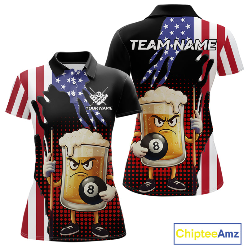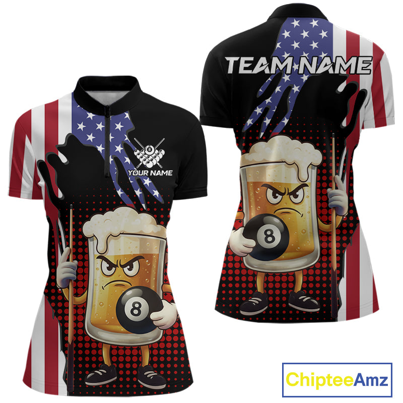 American Flag Funny Beer 8 Ball Billiard Shirt For Women Custom Patriotic Pool Team Jersey TDM5577