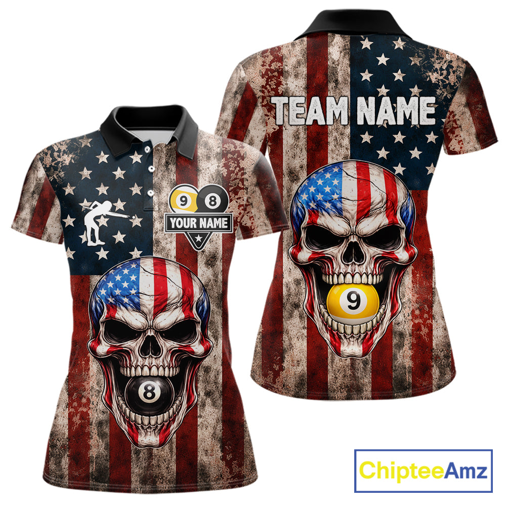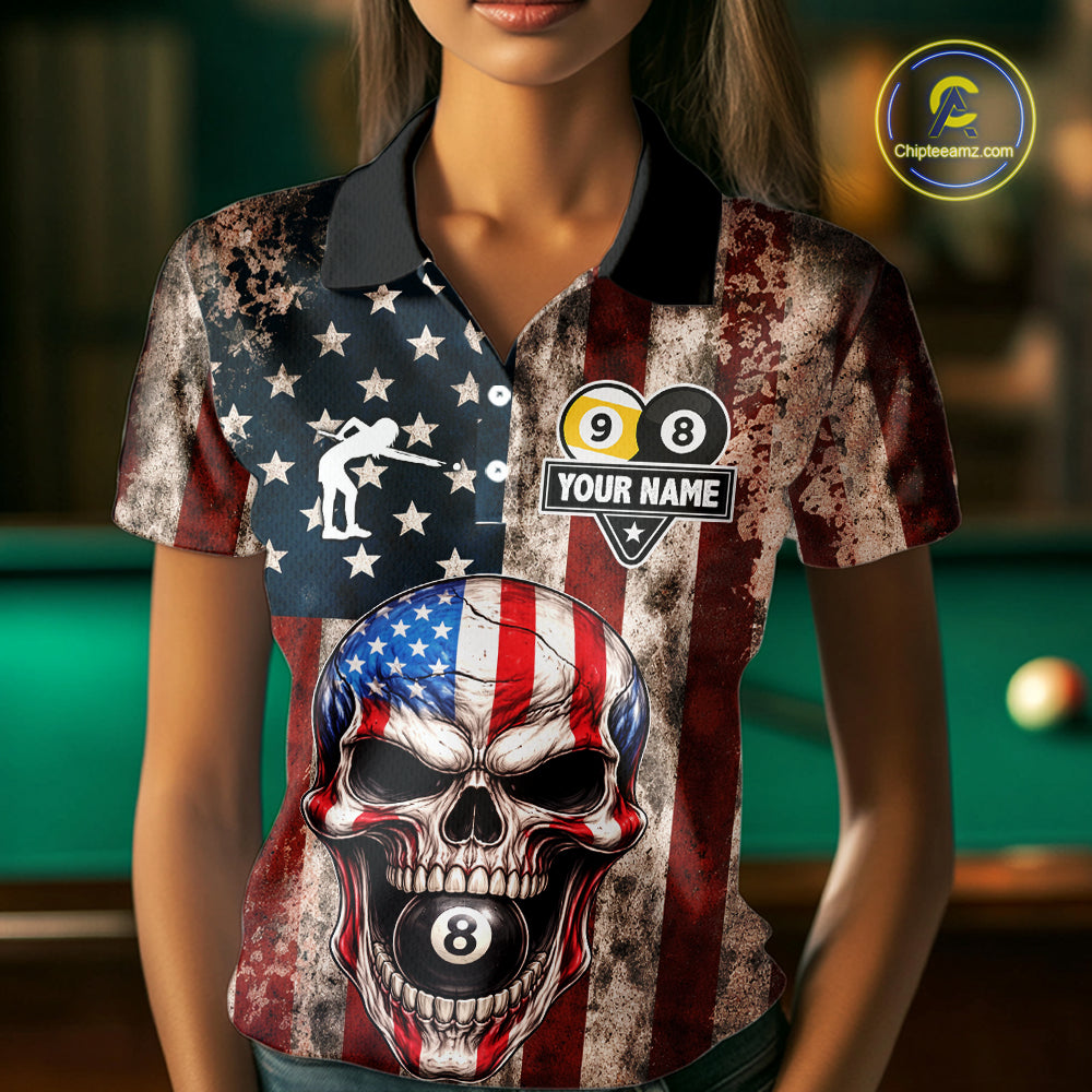 Vintage American Flag Skull 8 Ball 9 Ball Billiard Shirt For Women Custom Patriotic Pool Team Jersey TDM5656