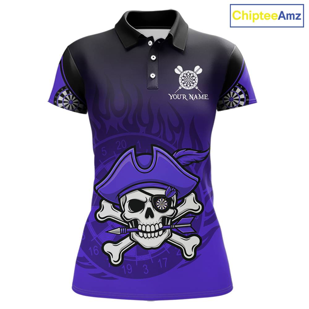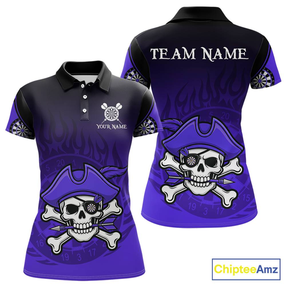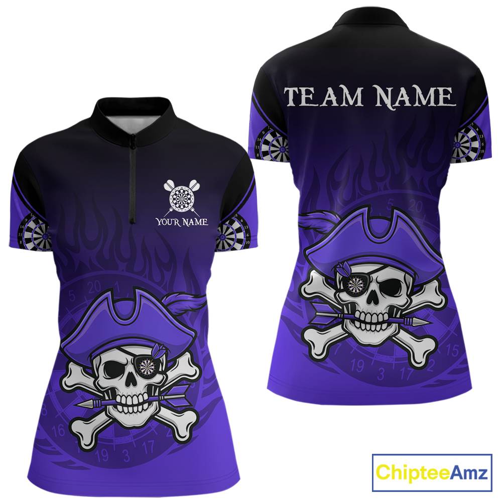 Black Purple Funny Pirate Flame Skull Darts Shirt For Women Custom Dart Jerseys Team Polo & 1/4 Zip TDM5704