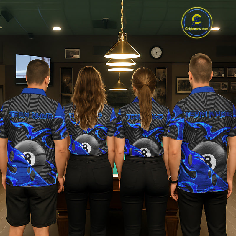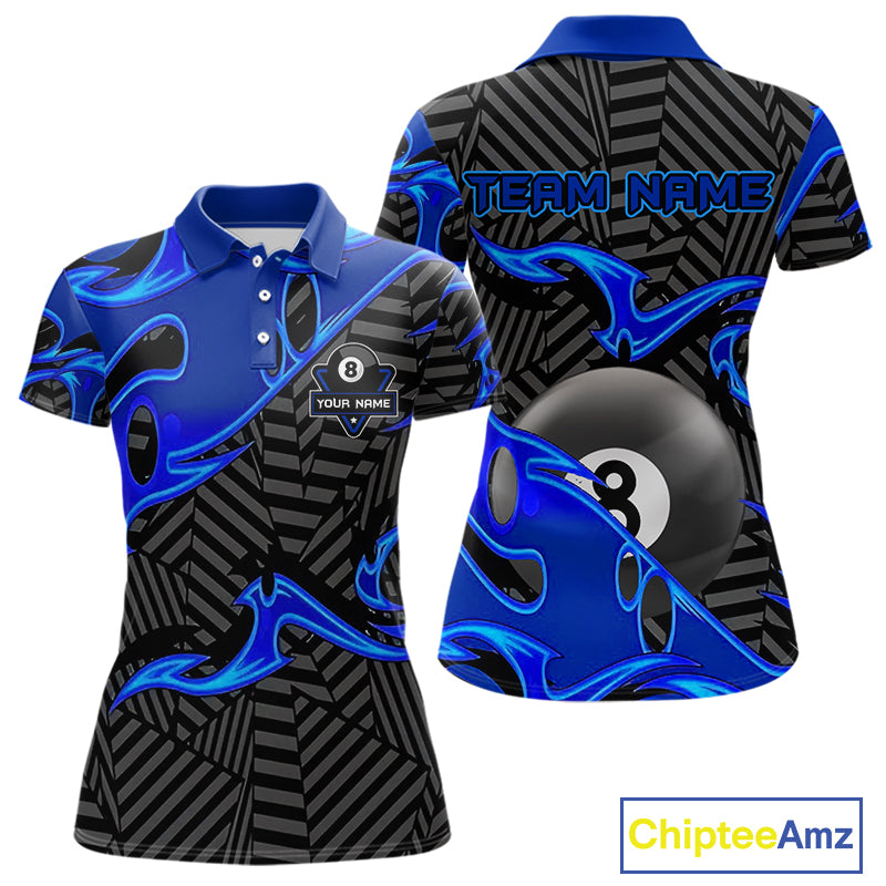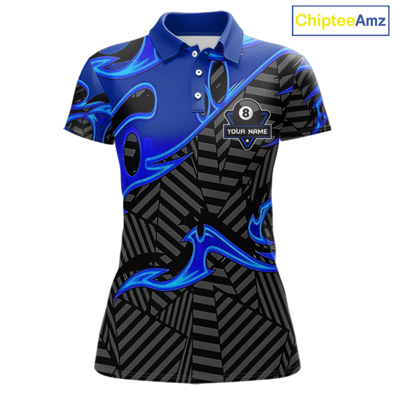 Custom Black And Blue 8 Ball Tribal Flame Billiard Shirt For Women, Pool Team Jersey Polo & 1/4 Zip TDM5724