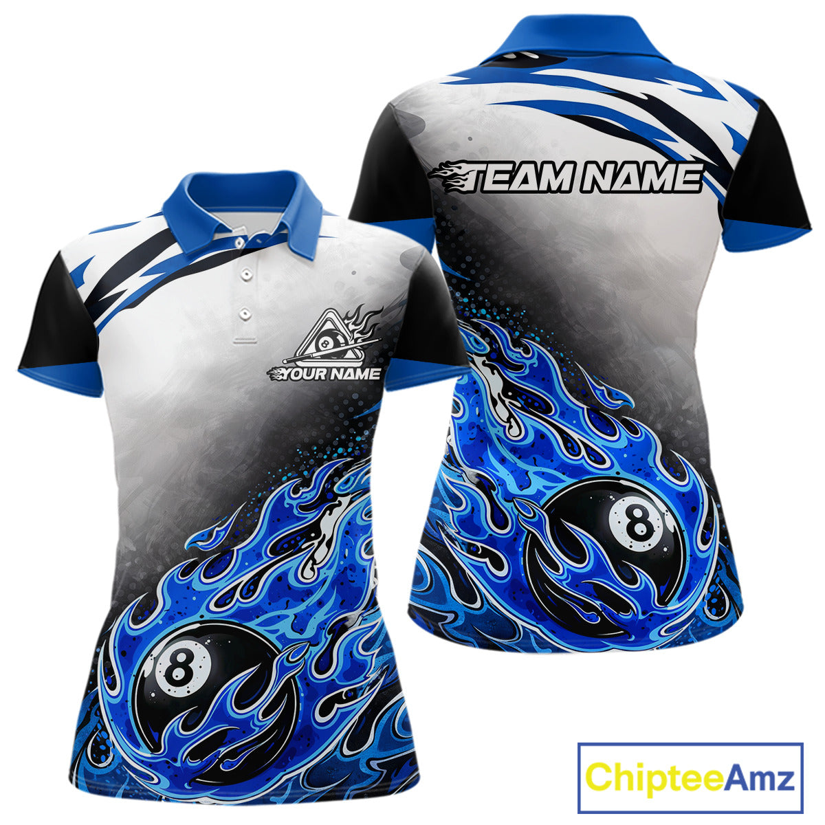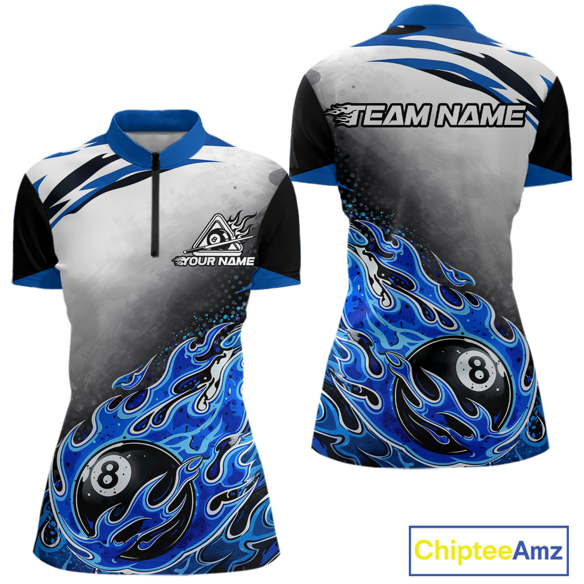 Blue Flaming 8 Ball Billiard Jersey Custom Women's Billiard Polo & Quarter Zip, Pool Team Jersey TDM5725