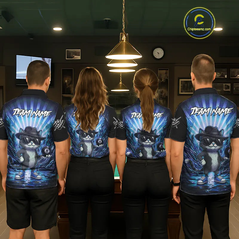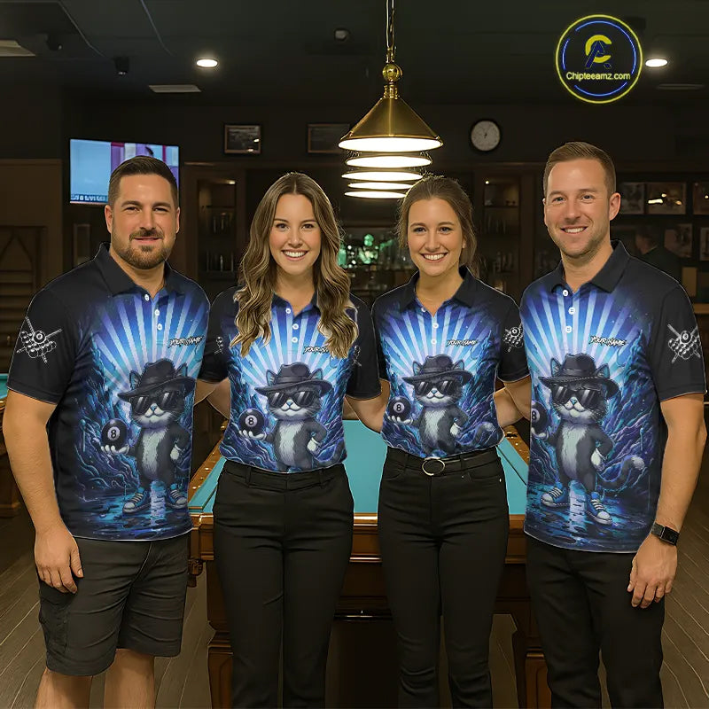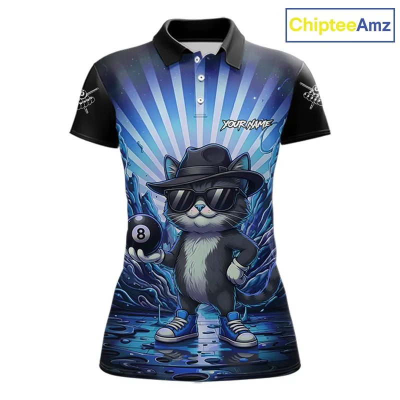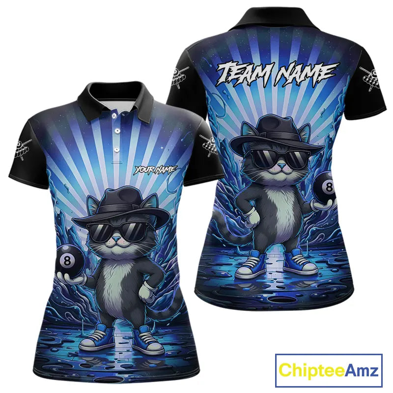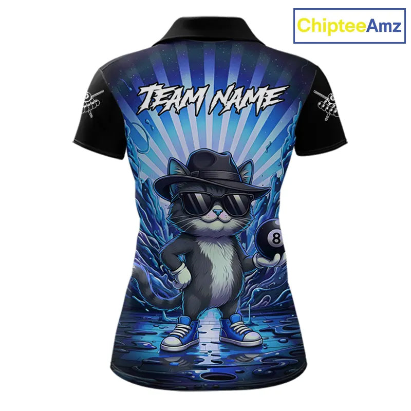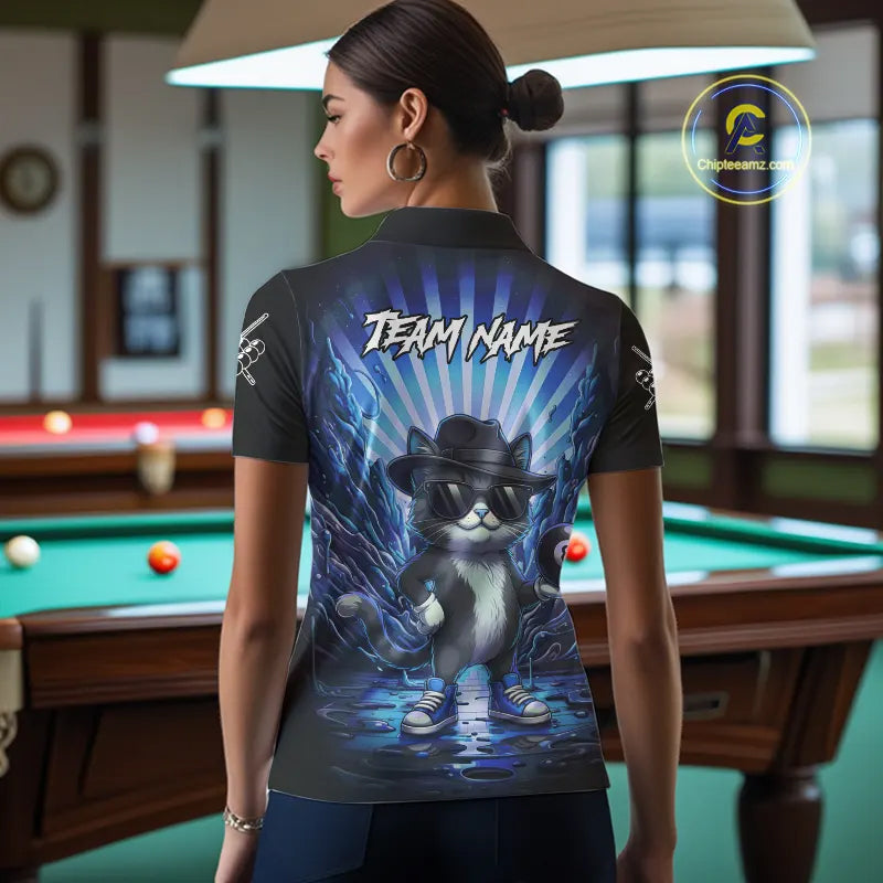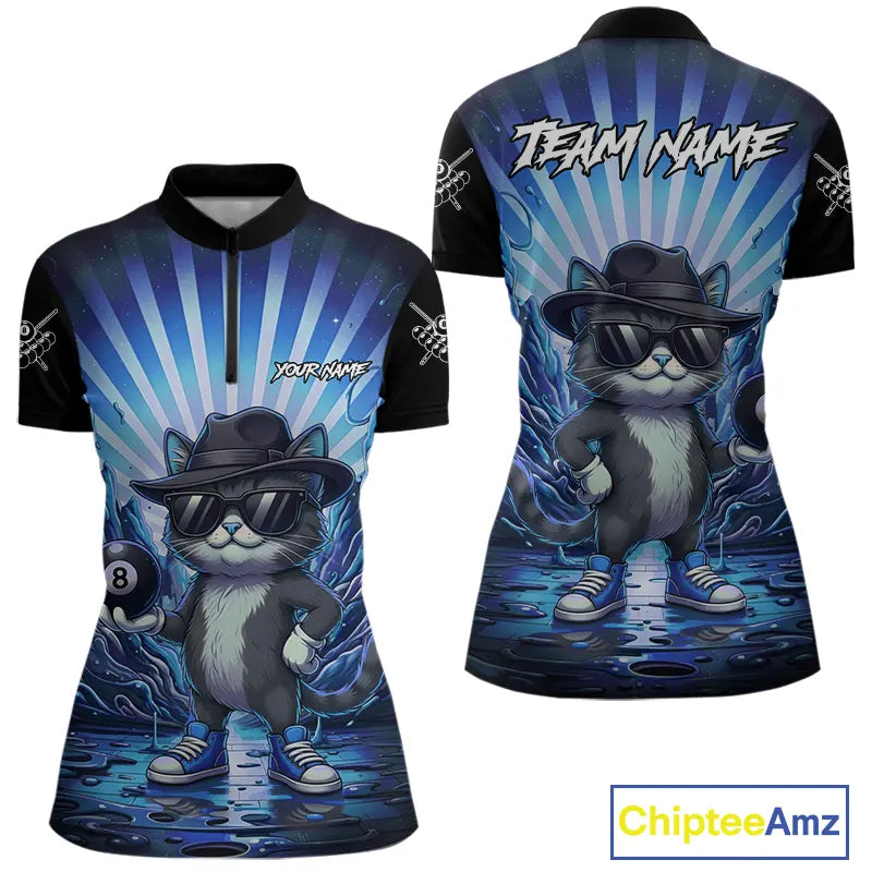 Funny Cat 8 Ball Billiard Shirt For Women Custom Blue Neon Graffiti Billiard Jersey Polo & 1/4 Zip TDM5742